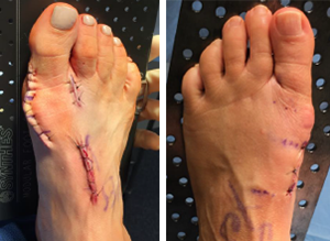 Incisions over a bunion treated with open surgery (left) compared to one treated with minimally invasive surgery (right).